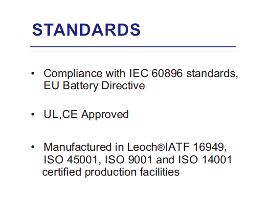 CE – UL – IEC 60896 – ISO 9001 – ISO 14001 – ISO 45001 – IATF 16949